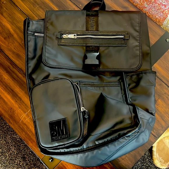 Black Steve Madden backpack. Great pockets, water bottle storage on sides, cell phone pocket in from and zip pocket inside. Has faux leather trim and straps which are long and adjustable. Material is a durable poly blend.