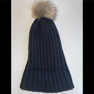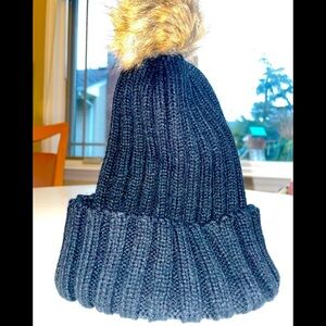 Black Woven Beanie with Faux-Fur Pom Pom Super Warm