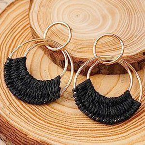 Black Woven Raffia Gold Hoop Earrings Wicker Hoops Links Post Vacation Style New