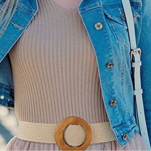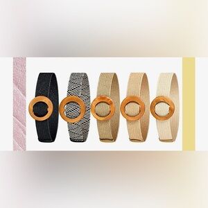 Women Straw Woven Elastic Stretch Waist Belt Skinny Braided Waist Belt Boho Rattan Belts with Wood Buckle Belts for Women Dress Belt