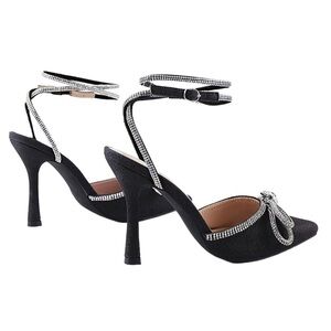 Black Wrap Slingback Rhinestone Embellished Bow Heeled Ankle Strap 3 7/8…