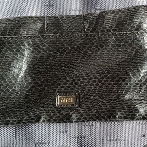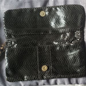 Black leather wristlet with a bow front, one pocket, and snap closure.