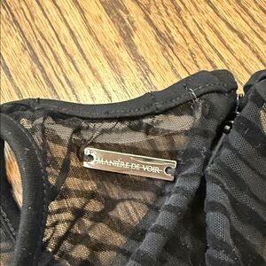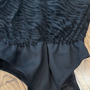 Stylish black bodysuit with zebra print design. Perfect for a bold sexy look, it is sheer down the middle and on the back. I love it, but it is too small for my medium body.