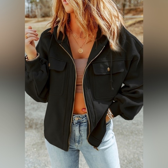 Cute!! Black Zip Jacket w/Breast Pockets. Jacket has hood & sleeves & upper half is fleece. So soft & cozy!
