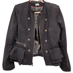 Black blazer / jacket features a full front zip closure, one front zipper pocket, non-functional button detail, and a small peplum ruffle hemline.