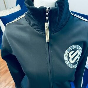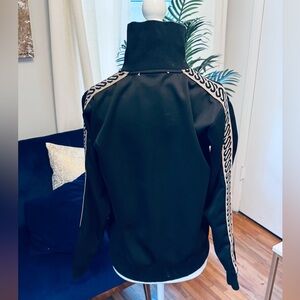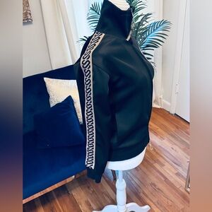 Stay stylish and comfortable with this sleek black zip-up jacket featuring elegant gold accents. Perfect for any casual outing.