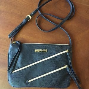NWOT Kenneth Cole black leather-like purse. So cute for a little daytime bag or use as your night out purse! Never used, perfect condition. Ready to find it's new home in your closet! Bag is black with gold zippers, and is 10"x7".