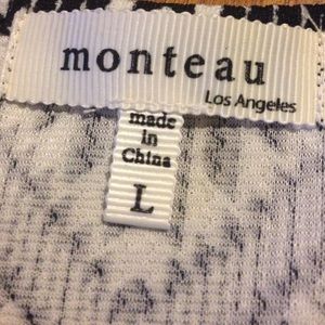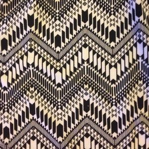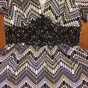 This item is a black and white patterned V neck dress. The dress is short sleeve and has a pinched waist where the black lace belt.