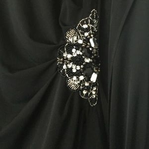 This elegant beauty is perfect for any after-five occasion. It has only been worn once and it has unique rhinestone-beading on the left side of the dress. It also has sheer sleeves. GREAT DEAL!