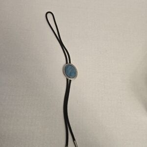 Stylish black bolo tie with a blue stone centerpiece. Perfect for adding a unique touch to any outfit.