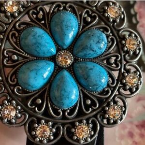 Stylish black belt with blue embellishments, perfect for adding a touch of elegance to any outfit.