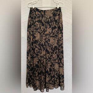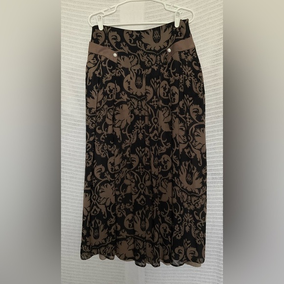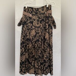 This skirt showcases a captivating black and brown pattern, ideal for cocktail. Its midi length and pencil silhouette offer a chic and sophisticated look. The intricate design adds a touch of elegance to your evening ensemble.