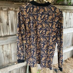 Black and brown / rust coloured paisley long sleeve polo style shirt. In breathable 100% cotton. Finished collar and sleeves with faux front pocket and shiny buttons at neckline. In great condition, some wear (see photo with color and cuff) By Consequence, size Small. #paisleypolo