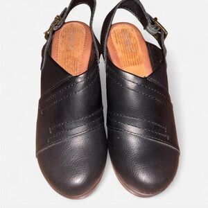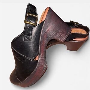 These stylish mules feature a sleek black leather upper paired with a contrasting chunky brown platform and heel. The adjustable slingback strap ensures a secure fit, while the closed toe and stitching details add a touch of sophistication.