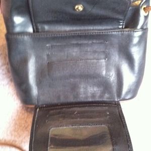 Has a leather like feel. Main compartment has a zipper with a small zipper pouch inside. The smaller outer compartment is closed with a button and also has a space for credit cards. This is a small purse.