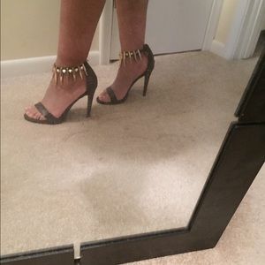Black and Brown Just Fab heels with gold trimmings. Never worn. Very cute shoe with a 4.5"heel height. The shoe is true to size but the strap across the toes are a lil loose but not un-walkable, or un-wearable.