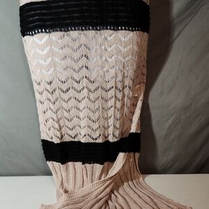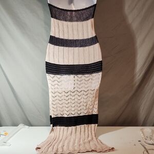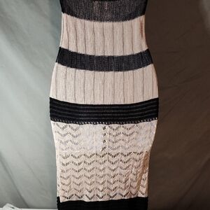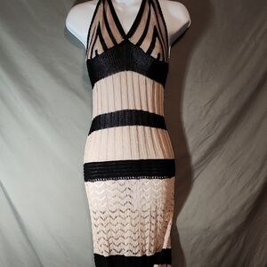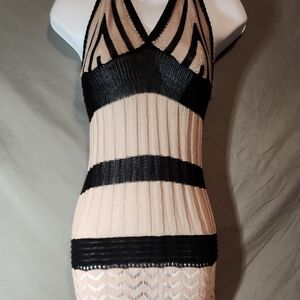 This elegant swim coverup showcases a sophisticated black and cream palette with a sleek bodycon silhouette. The halter neckline adds a touch of allure, making it ideal for a cocktail evening by the pool. Its sleeveless design ensures a comfortable and stylish fit for any night out occasion.
