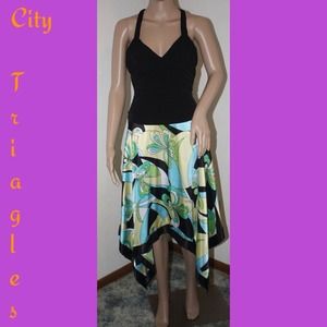 A beautiful black and floral halter dress. It has asymmetrical sides.                                             Material:  100% Polyester                                        Shoulder to Shoulder:  X                                     Bust:  12"                                                               Waist:  11"                                                                  Total Length:  43"  Front      50"  Sides