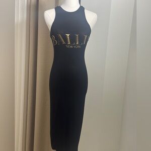 This stunning black and gold bodycon midi dress features a sleeveless design with a halter neckline, perfect for a night out. The dress is crafted from a stretchy material that hugs the body, creating a sleek silhouette. The gold 'BALLY' text on the front adds a touch of elegance to the minimalist design.