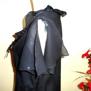 Beautiful blouse from UK fashion house BonMarche. Sheer black with delicate gold floral detail. Pretty black bow at the front with a frilly collar. Dress up or dress down.