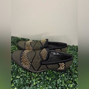 These loafers feature a striking black base adorned with intricate gold geometric patterns, offering a luxurious and sophisticated look. The slip-on design ensures comfort and ease, making them perfect for both casual and dressier occasions. The flat sole adds to the comfort, while the bold embellishments make a statement.