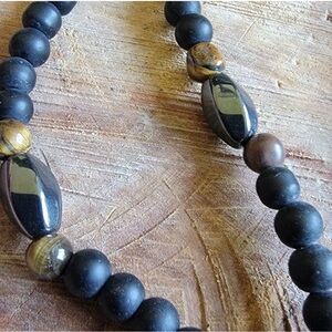 Black and Gold Hermatite and Lava Beaded Necklace with Triangle Pendant