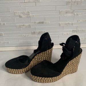 The Black and Gold J Lo Espadrille Wedge Heels are stylish and comfortable women's shoes featuring a round toe and a wedge heel. Made with black canvas material, these heels have a classic espadrille style that is perfect for any occasion. The JLO brand adds a touch of glamour, making these shoes a versatile addition to any wardrobe.