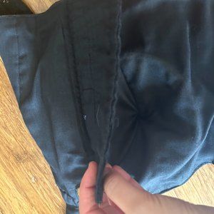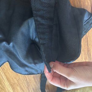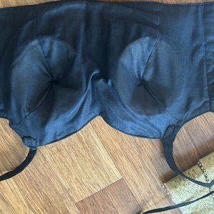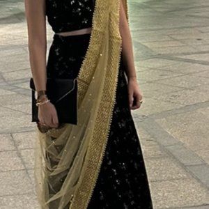 Tailored black and gold lehenga. Purchased December 2022 for $500, worn once and dry-cleaned. Includes, top, skirt with full petticoat, gold scarf and black and gold jeweled ornament. Blouse measures 14" W and 8 inches high with cups. Please see photos as blouse was taken by several inches on both sides and can be taken out. Skirt is 42 " L and 18" W.