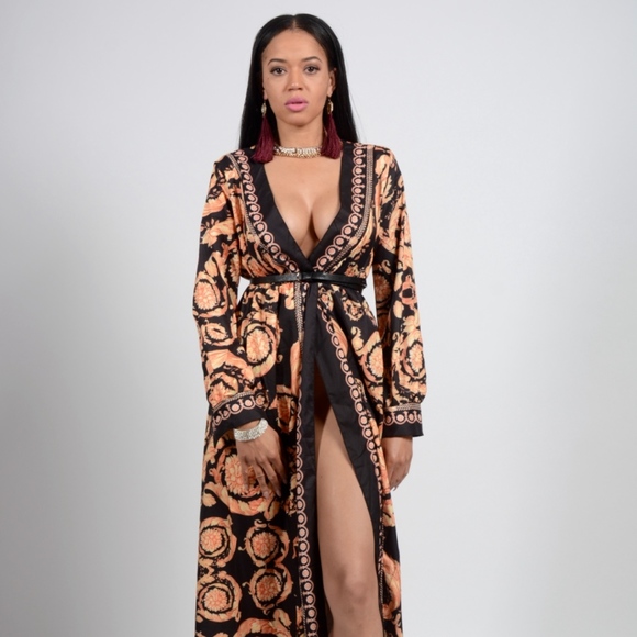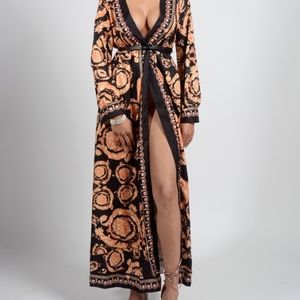 Loose fit high slit kimono sleeve maxi dress, looks really nice with one piece leotard or black leggings. This garment is extremely lightweight.