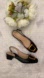 New Black and Gold Minimalist Career Block Heels Squared Toe Slingback Shoes.