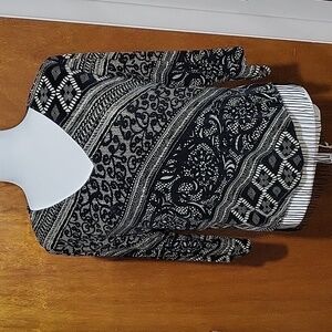Stylish black and gray patterned sweater with fringe detailing. Perfect for adding a chic touch to any outfit. This is pre-loved and is in perfect condition. There are no tags but measurements suggest this is a medium