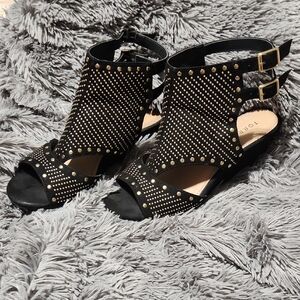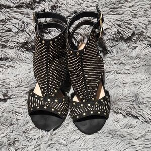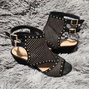 Elegant black wedges with gold studs. Features double buckle closure. Stylish and versatile.