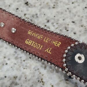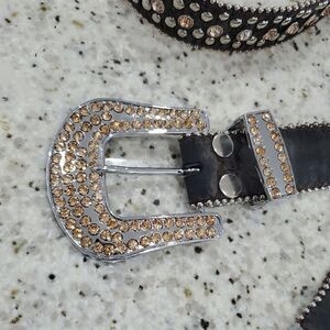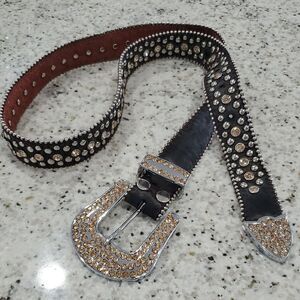This striking belt features a luxurious black and gold color scheme, enhanced by a series of shiny studs that add a touch of elegance. The ornate buckle, crafted with intricate detailing, serves as a captivating focal point. Made from high-quality leather, this accessory is perfect for elevating any ensemble. Missing one stone, as shown, not noticeable . Actual length is 46 inches, fits a 34-40 at notches