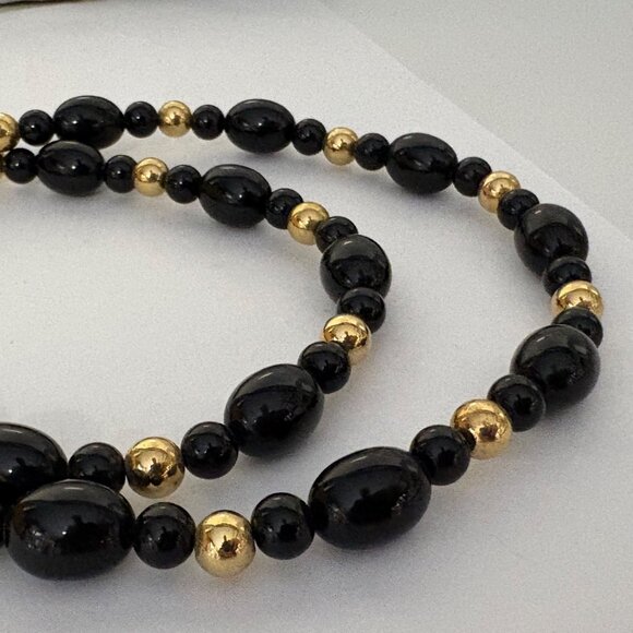 Black and Gold Tone Beaded Necklace Oval and Round Beads 30 in Classic Versatile