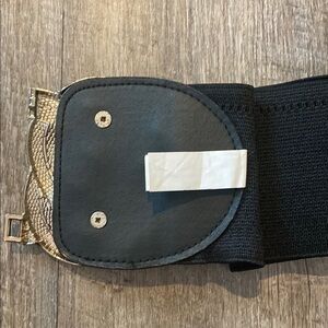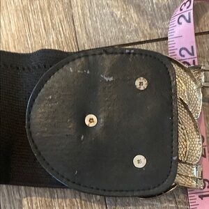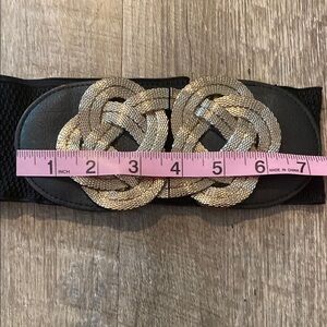 This striking belt features a wide black elastic band complemented by a large, decorative gold buckle. The intricate knotwork design of the buckle adds a touch of elegance and sophistication, making it a standout accessory for any outfit.