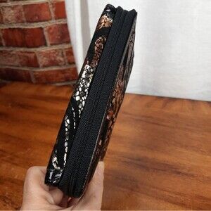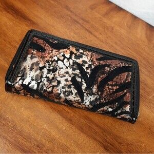 This s a beautiful little full zip wallet that is in like new condition with original foam inside and has never been used. This wallet features an eye-catching black, gold, and silver design. There is a zipper compartment on one side with two open pockets and a zipper pocket, and a fold over flap compartment on the other side with 10 credit card pockets, an ID pocket, and a check book cover. This wallet is like new and perfect for any occasion with plenty of pockets and storage. It measures 4' by 7'. I do consider reasonable offers!! All items are shipped the same or the next business day!! All items are shipped the same or the next business day!! Bundle two or more items and receive an automatic 15% discount and combined hipping at checkout!!