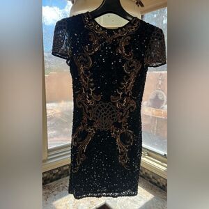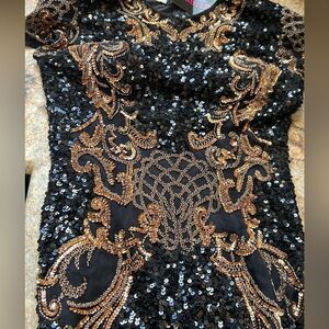 Elegant black dress with intricate gold sequin detailing. Perfect for special occasions.