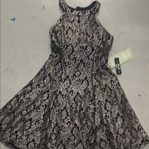 This stunning dress features a sleeveless halter neckline and a fit and flare silhouette, perfect for prom or a night out. The intricate black and gray pattern adds a touch of sophistication, while the flared skirt creates a flattering shape.