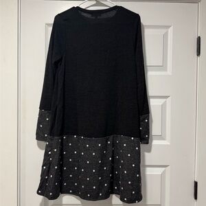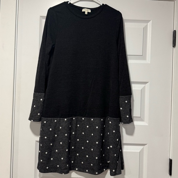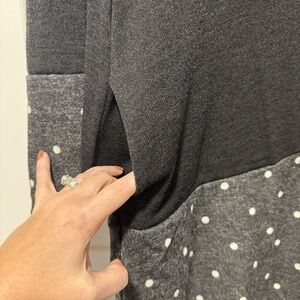 Chic and stylish black and gray midi dress with playful polka dots. Perfect for any occasion.