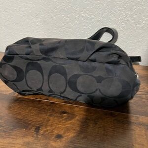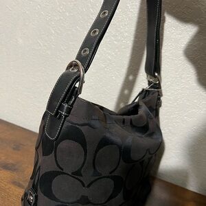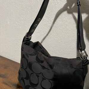 Stylish black and gray shoulder bag with signature pattern. Features silver hardware and adjustable strap.