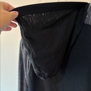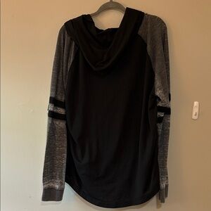 Stylish women's jersey hoodie featuring a black body with gray sleeves. Perfect for casual outings.