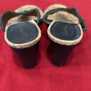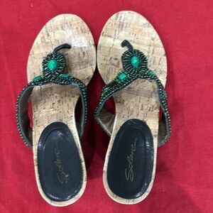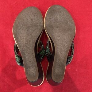 These sandals feature a comfortable cork-textured footbed and a stylish thong design, perfect for casual summer outings. The black and green color combination adds a touch of elegance, making them a versatile choice for any occasion.