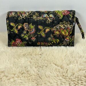 This elegant wallet features a striking floral design on a black background, complemented by a green hue. The front is adorned with a geometric band, adding a touch of sophistication. Its compact, rectangular shape makes it a perfect accessory for any occasion.