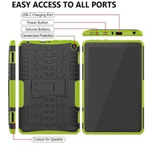The Rugged Tablet Case with Kickstand in Black & Green is a heavy-duty shockproof cover designed for Samsung tablets, specifically the Amazon Fire HD 8 (10th Generation, 2020 Release) and Amazon Kindle (8th Generation). Made of durable Thermoplastic Polyurethane material, this rugged case provides military-grade protection for your tablet. The green color adds a stylish touch, while the shockproof feature ensures your device stays safe from drops and impacts. The included kickstand offers added convenience for hands-free use. Ideal for those looking for a reliable and rugged case to keep their tablet safe and secure.