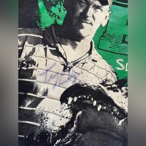 This short-sleeve tee features a striking black and green color scheme with a bold graphic design on the front. The vivid green text 'choir ‘em’ stands out against the black background, complemented by a detailed grayscale image. Perfect for making a statement in casual settings. SIGNED!