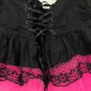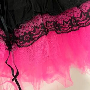 This unique layered ruffled miniskirt features hot pink tulle, black front lace up ribbon, black lace accents and trim, and a hidden back zipper.