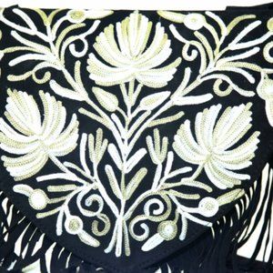 Be different with this custom designed suede embroidered crossbody bag with fringes.
