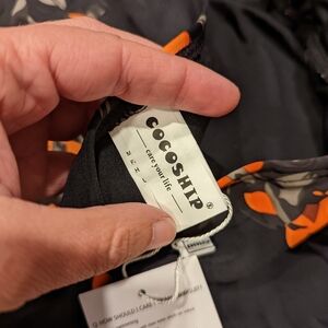 Stylish black swimsuit with vibrant orange floral pattern. Features a halter neck design.