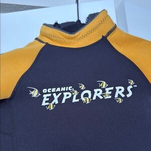 Experience the perfect blend of style and functionality with this black and orange wetsuit. Designed for water sports, it features a high collar and short sleeves for optimal comfort and protection. The dynamic color contrast adds a sporty edge to your swimwear collection.