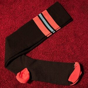 Comfortable and stylish knee high socks in black with pink and blue stripe accents. New. Stretchy yoga pant like material.